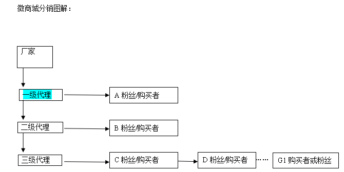 上图模式分解:三级分销模式升级,G1购买之后,CD粉丝都有返点,然后一级二级三级也同时有返点,返点的比例后台可以设置(厂家设置)。同理,二级分销和一级分销也是如此。这样既带动了全员分销又带动了销售业绩。这就是微商城的第二个魔性特征。