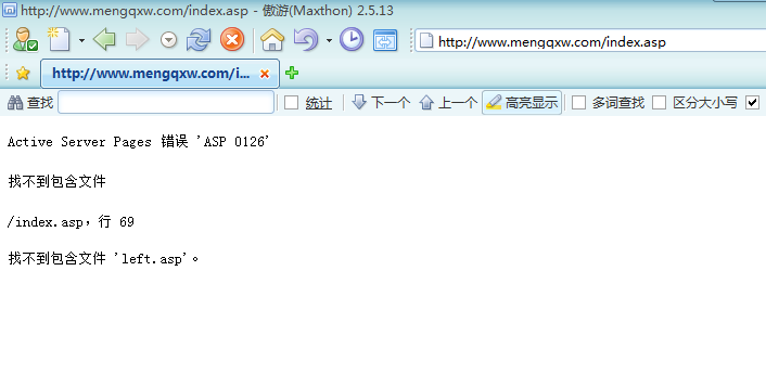 Active Server Pages 错误 'ASP 0126' 找不到包含文件 /index.asp,行 69 找不到包含文件 'left.asp'。 根据报错提示,找到该文件修复再次上传即可。
