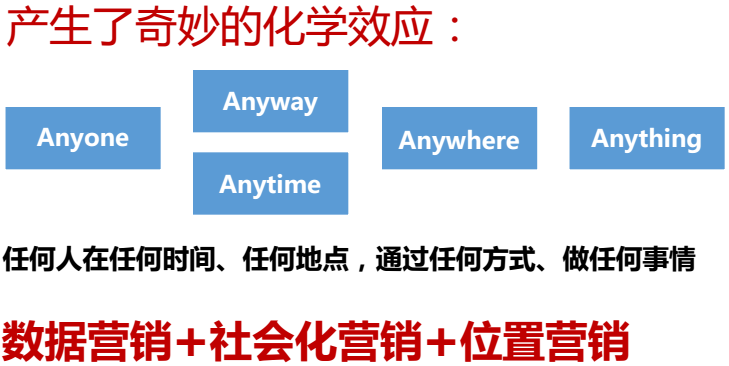 首先我们看看移动互联网的发展六大要点:1、逾8亿的移动终端潜在用户资源;2、社交平台的开放带来的庞大用户;3、定位服务提供精准的营销推送;4、线上浏览线下的体验闭环流;5、快捷的移动支付提高交易完成度;6、用户的碎片时间更多获取信息。移动互联网由这六大变革带来了互联网式的化学反应,请看下图: